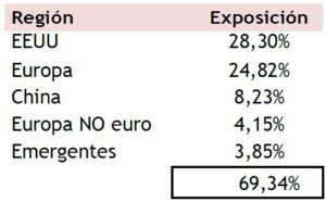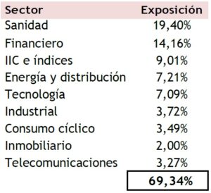 A 30 de junio de 2024 nuestra exposición en renta variable era del 69% del patrimonio, por encima de nuestras medias históricas. La cartera se mantiene muy diversificada, tanto geográficamente como sectorialmente. Hay que resaltar que vamos manteniendo un gran peso en Estado Unidos. Por otro lado, dada la calidad de las empresas del sector sanidad, y aprovechando sus correcciones, hemos aumentado sus posiciones.