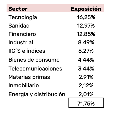 La cartera sigue muy diversificada, tanto geográficamente como sectorialmente. Vamos aumentando las inversiones en Norteamérica. El sector de cuidados de la salud y el tecnológico son los más importantes. Mientras el primero aporta mucha estabilidad a las inversiones, el segundo introduce el potencial propio de la innovación, y por tanto más recorrido a las inversiones La reciente subida de los tipos de interés está beneficiando al sector financiero, por lo que también ha sido destino del incremento de exposición a bolsa. Empresas industriales y de servicios ocupan un lugar relevante también.