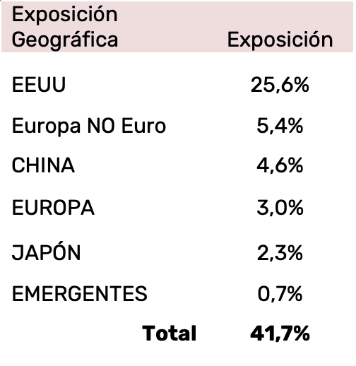 Continuamos favoreciendo una sobreponderación de tipo estructural a EEUU, en detrimento de Europa. Tenemos el convencimiento que este posicionamiento estratégico dará sus frutos en el largo plazo. EEUU se caracteriza por una gran creatividad empresarial, una ferviente innovación tecnológica y una mayor seguridad jurídica, aspectos muy relevantes para la creación de valor a largo plazo. Sí es algo más notable nuestra presencia en países europeos de moneda NO euro. Dicha exposición se manifiesta a través de posiciones que aportan un gran valor añadido; como Roche y Novartis, empresas suizas líderes dentro del sector farmacéutico y Reckitt Benckiser, compañía de bienes de consumo propietaria de marcas ampliamente reconocidas como Finish, Vanish, Calgon o Durex, entre otras.