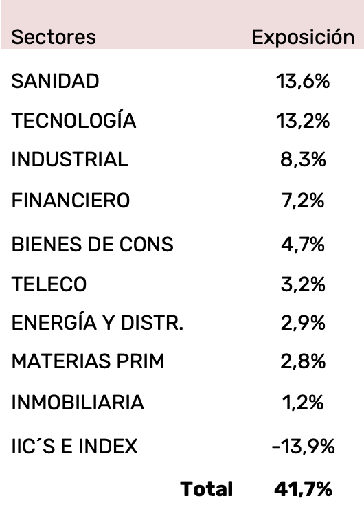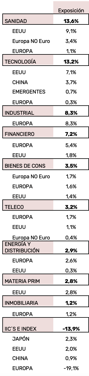 Sí existe cierta exposición directa a la banca, en concreto algo más de un 2% entre BNP e ING. No obstante, se hace importante destacar que las coberturas realizadas mediante la venta de futuros de EUROSTOXX50 mitigarían de forma relevante la exposición al sector bancario. Si tenemos en cuenta este factor, la exposición global de la cartera a la banca es nula o, incluso, negativa.