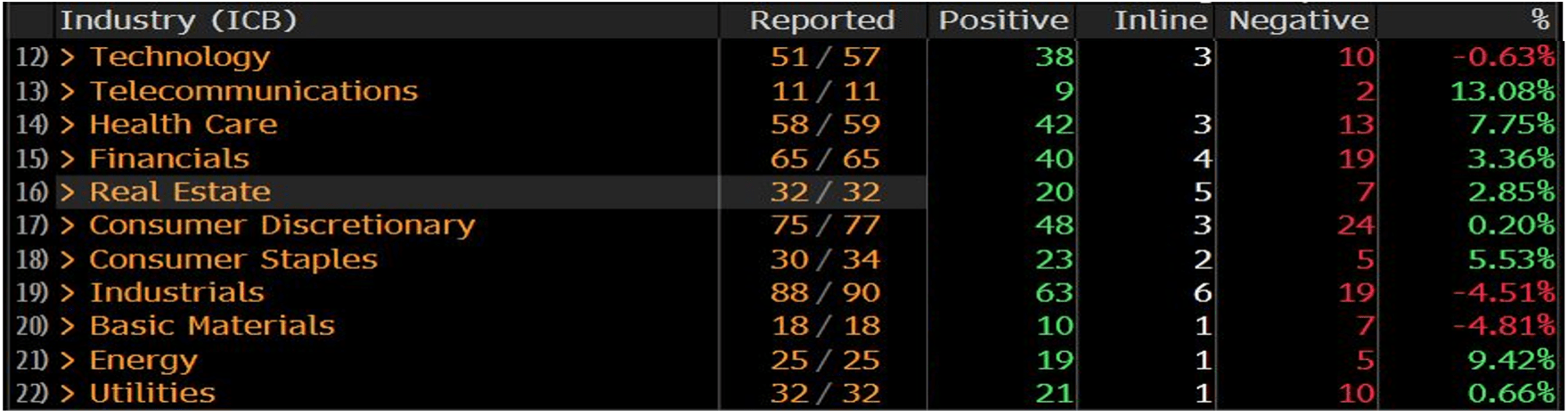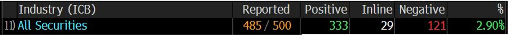 La columna “Positive” recoge a todas aquellas empresas que han informado de beneficios mejores a lo esperado. “Inline”, serían aquellas cuyos beneficios han sido iguales a los esperados por los analistas. “Negative”, las empresas cuyos beneficios han sido menores a lo que descontaban los expertos. Interesante no dejar de lado la última columna “%”, que nos explicaría el porcentaje en el que, de media, los beneficios han sido superiores o inferiores a lo esperado por los analistas.